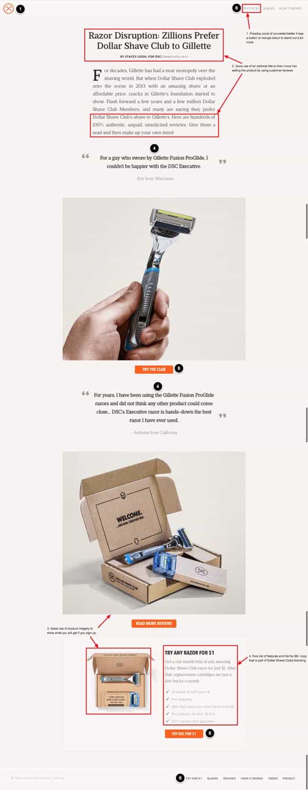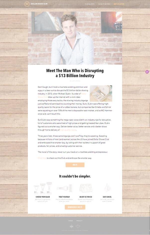 It works because it is written like a third party editorial that extols the virtues of Dollar Shave Club. It’s highlighting the clever innovation behind their subscription model and their surprise success against Gillette. It suggests that, by becoming one of DSC’s ‘members’, you will also be joining this exclusive club of loveable rogues.