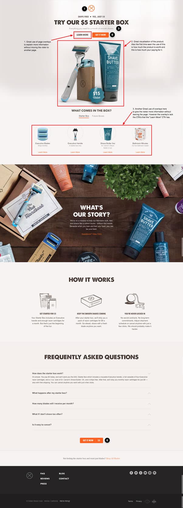 DSC knows their target audience – men who shave – incredibly well. This is reflected in their brand’s tone. DSC clearly funnels a huge amount of resources and budget into their website and have optimized it for conversions by emphasizing one call-to-action. A customer can’t help but convert.
