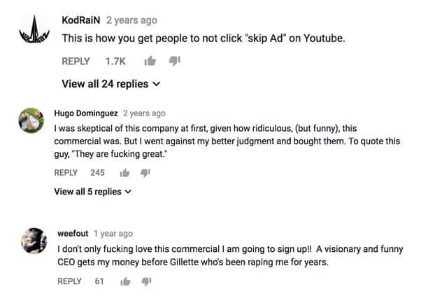 By calling their video ‘Our Blades are F***ing Great’, this plays on the lazy technique of men’s grooming products of not-so-subtle overselling. It humorously makes their message explicit, and their audience loved it.