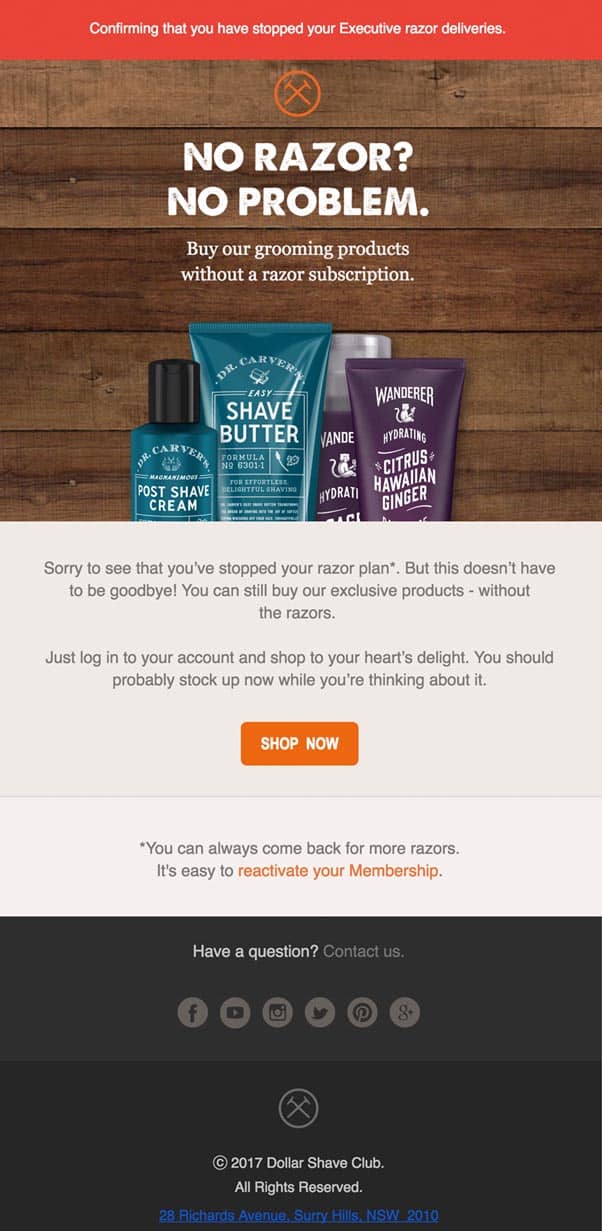 Here’s another example of where they have used another transactional email as an opportunity to market to their customers. They’re reminding their customers that even though they’ve ‘cancelled’ their subscription, they are still able to buy other products from DSC’s online store. It’s another situation where DSC is sneakily upselling to make sure they get the most out of each and every customer.