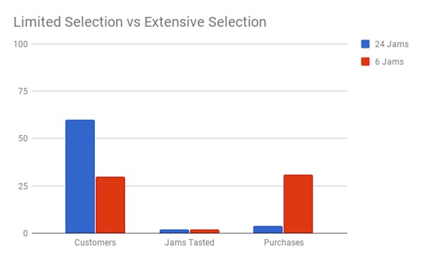 They set up a jam tasting booth in a grocery store. All the jams a customer could ever want were back there on the shelves. But they were more likely to make a purchase when they were presented with just a few of all those options.